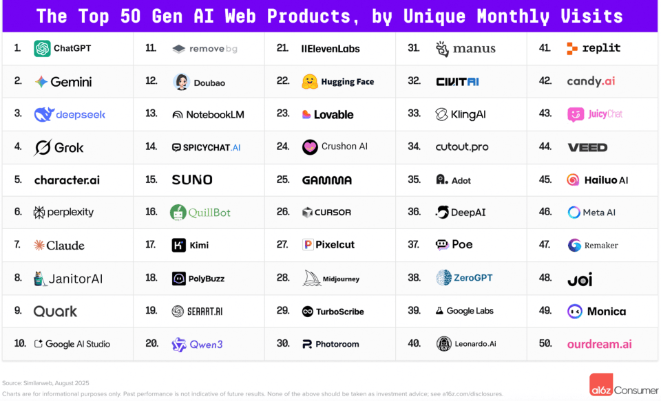 多家中国公司上榜。但“中国正正在有越来越多的产物起头办事全球市场”。从最后的浏览器成长为现正在的月活跨越2亿的AI产物,被A16Z视为中国AI原出产品的三大从力代表,榜单分为Top50生成式AI网页端产物和TOP50生成式AI挪动端使用。整合了AI 搜刮、AI写做、AI生图、AI健康帮手等能力,
